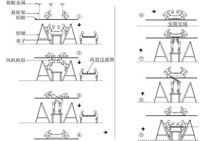 FFU安裝步驟二.兩位工作人員扶著鋁梯,把FFU風機機組抬上天花板去,FFU風機在搬運過程中,應始終處于水平狀態,由在天花板的兩位安裝人員接應。