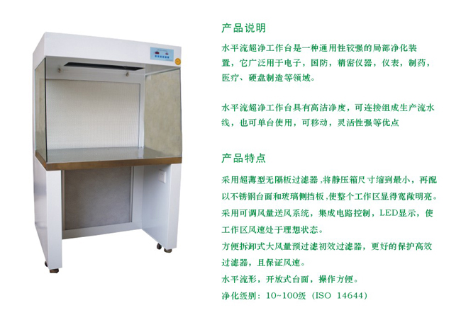 當(dāng)前位置:首頁(yè) >> 空氣凈化設(shè)備 >> 超凈工作臺(tái) >> 水平流超凈工作臺(tái)水平流超凈工作臺(tái)是一種通用性較強(qiáng)的局部潔凈工作臺(tái),適合高潔凈度的生產(chǎn)車(chē)間,可串聯(lián)一起控制使用。水平流超凈工作臺(tái)適用領(lǐng)域:微電子、實(shí)驗(yàn)室、國(guó)防、精密儀器、儀表、生物制藥、光電產(chǎn)業(yè)、硬盤(pán)制造領(lǐng)域等。 水平流超凈工作臺(tái)圖片 水平流超凈工作臺(tái)特點(diǎn)展示: 1、采用超薄型的無(wú)隔板過(guò)濾器,將靜壓箱尺寸縮到最小,配以不銹鋼臺(tái)面和玻璃側(cè)擋板,使整個(gè)工作區(qū)顯得寬敞明亮; 2、方 …