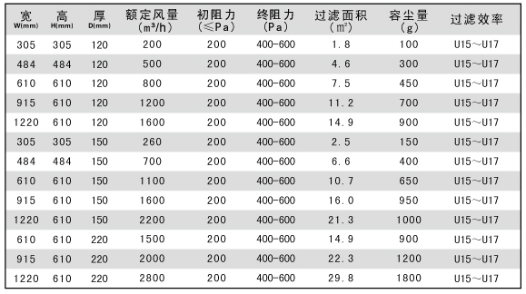 用戶選購指南-U15-U16無隔板超高效過濾器技術參數